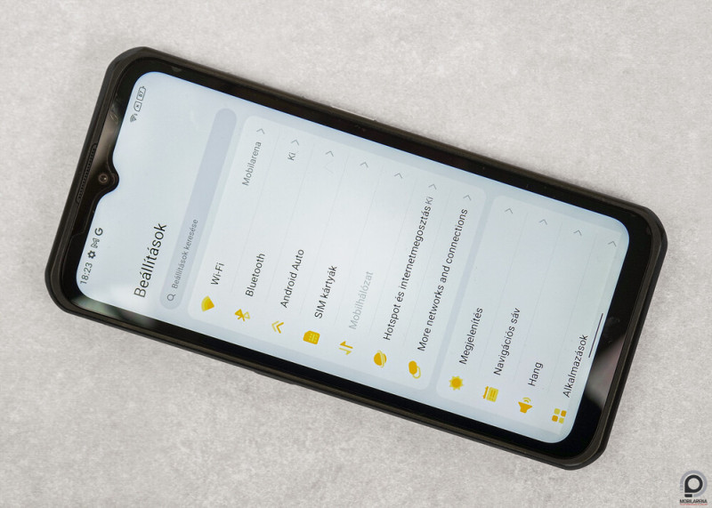 Lőn világosság: bár ennek a strapamobilnak sem jutott 1000 nites AMOLED panel, a mellékelt IPS remek fényerejű a kinti használatra jó kontrasztaránnyal, kézzel igazítható, kissé hűvös kalibrációval, elfogadható betekintési szögekkel és színekkel, valamint jófajta érintésérzékeléssel, kesztyűben, nedves környezetben egyaránt. Ehhez tesz hozzá a 120 Hz-es képfrissítés 240 Hz-es érintésérzékeléssel, és még víz alatti kameramód is akad, ha csak a gombokkal szeretnénk a medencében bajlódni. A fénymérő és a közelségérzékelő éppúgy rendben teszi a dolgát, mint az értesítő LED és a multimédiás lejátszásba bekapcsolódó beszédhangszóró. A gyenge pont a koromsötétben bántóan világos minimális fényerő, amelyen a sárgás éjjeli mód keveset tompít.