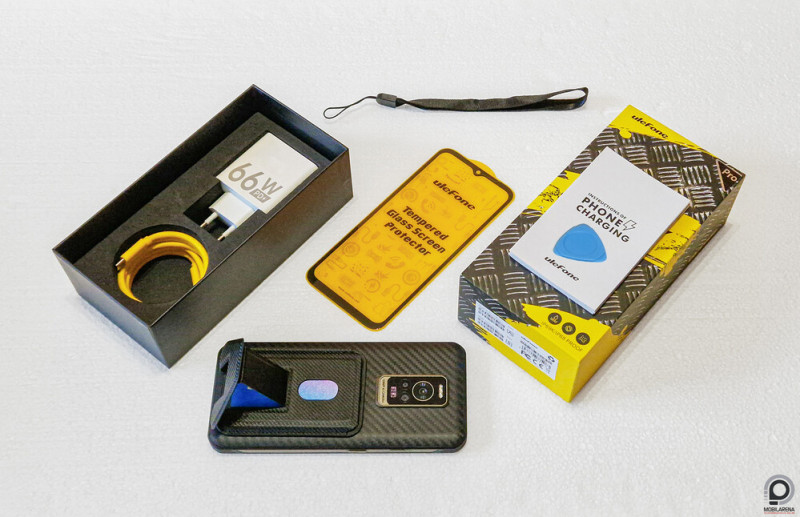 A korrektül tapadó plasztik hátlap Apple MagSafe-hez hasonló mágneseket is kapott Qi-szabványú bigyók és a mágneses töltőlapok stabil csatlakozására. A sárga-fekete csomagban pedig egy mágneses kártyatartó is akad, ami az Armor 17 Pro támasztékaként is szolgál. Végül előbányászható egy gitárpengető a dupla nanoSIM és microSD tálcahármas kitolására (ami körömmel is abszolválható), a töltőfej, a két végén Type-C típusú kábel, a leíráshalmaz és a bal alsó sarokba fűzhető csuklóakasztó. Szép gyűjtemény, hogy a forrástól függően 135-150 ezres ár ne fájjon annyira.