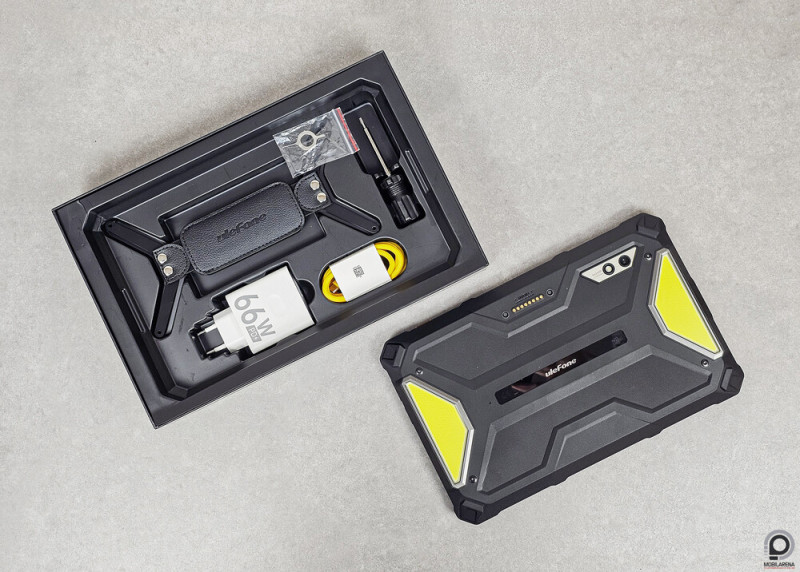 Még jó, hogy a pakkban a fólia, a leírás, a 66 wattos USB-PD töltő, a SIM tű és a két végén Type-C kábel mellett ott a csavarhúzó, pár pótcsavar és a hátlapra felerősíthető csukló-, vagyis inkább tenyérpánt. Négy csavarral rögzítve és tenyerünket átbújtatva ugyanis könnyebb a 261,7 x 166,8 x 21,2 milliméteres monstrumot hosszú ideig tartani, a pánttal pedig felakaszthatjuk valahova. Van lámpaapp is, ami mondjuk nem mindig ugrik fel bekapcsoláskor, és elég suta, hogy csak állóhelyzetben fut, nem fordul el fekvőbe.