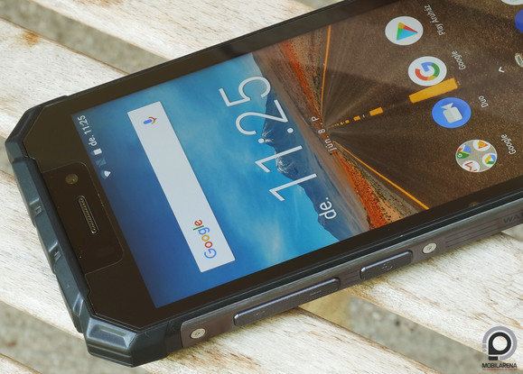 A strapabíró küllem és a különféle tesztek teljesítése mindenképp pluszköltség a gyártónak (bár a Mil-STD 810G minősítések ezúttal elmaradtak), amit először a kijelző szokott megsínyleni. Bár 5,5”-en a HD+ panel semmiképp sem tűéles, de azért elfogadható rajzolatú, odakint pedig szerencsére kellően világos, némi színváltozással járó, elfogadható betekintési szögekkel. A kalibráció viszont kissé kékes, éjszaka pedig harsányan világos a legalacsonyabbra vett fényerő. Ráadásul némi érintési késedelem is van az érintőpanelen, bár ez inkább a hardver számlájára írható, ott szokott ugyanis folytatódni a strapakategória áldozathozatala. Elöl fénymérő, közelségérzékelő, beszélgetési hangszóró, értesítő LED és 5 megapixeles kamera kapott helyet, illetve alul háttérvilágítást nélkülöző alkalmazásváltó, főképernyő és visszalépés érintőgomb.