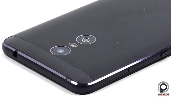 Vagyis hát megnyugtató volna, mert mindjárt beleszaladtunk egy váratlan negatívumba: a Gorilla Glass 3 előlapon a kijelző védőfóliáját még gond nélkül lehúztuk (egy kis buborék maradt alatta), amikor viszont a jól odaragasztott hátlapi plasztik ragacsot emeltük le, három ponton is magával ragadott a fekete/sötétlila festékből egy-egy pöttyöt. Vajon egy év használattal menni marad meg a fekete, a szürke vagy az aranyszínű bevonatból, ha a matrica is leszed belőle? Mindennek ellenére tényleg egy drágább telefon hatását kelti az uleFone Gemini, ezt jelzi a matt hátlap dupla kamerarendszere és villanója, de még a két műanyag antennakilépő sáv sem zavar bele túlzottan az esztétikába. Rejtőzködőbb plasztik csíkokat már láttunk, de az eredmény így is ízléses.