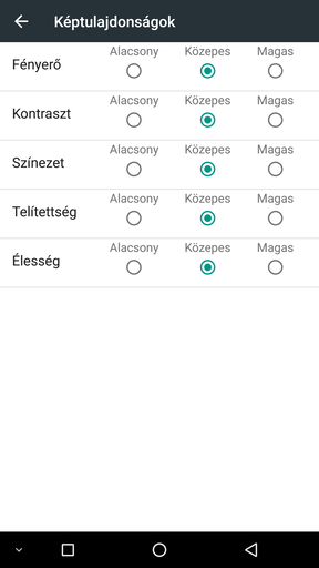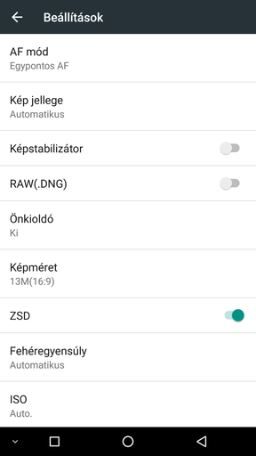 A kameramódokhoz (normál és panoráma) a bal felső sarokban lévő narancssárga ikon vezet, alant pedig előtűnik a beállítások, ahol lényegesen nagyobb mozgásteret kapunk. Az autofókusz például lehet egypontos vagy többzónás, egyik sem eredményez javulást. A kép jellege kikapcsolható ahogy van, kérhetjük, hogy automatikusan igazodjon, vagy választhatunk egy aránylag hosszú listából. A fehéregyensúly szintén sematikus, értékeket nem kapunk, az ISO viszont 100 és 1600 között módosítható. A képtulajdonságok pedig az AOSP megoldáshoz hasonlóan alacsony-közepes-magas viszonylatban állíthatóak.