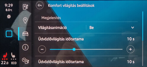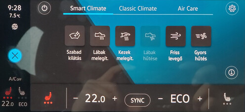 Miközben viszont bizonyos menüpontok frankón meg vannak csinálva, az autót forgató beállítási opciók ötletesek (már csak a kocsi színének kéne stimmelnie), igazából a “smart climate” menüpont is jópofa (de ezt nem sikerült magyarra fordítani), itt nem a szokásos klímagombok vannak (de azokat is kérhetjük), hanem ilyenek, hogy lábmelegítés, meg tiszta kilátás, ami úgy állít be mindent, hogy ripsz-ropsz leküldje a párát az első szélvédőről a légkondi, miközben mi sem fagyunk meg. Ötletes az elköszönő képernyő is, ahol bállíthatunk töltési maximumot és állófűtést, meg még azért is szól, hogy a telefont ne hagyjuk a kocsiban.