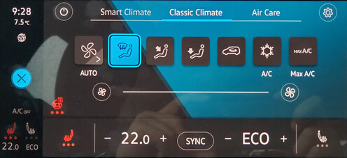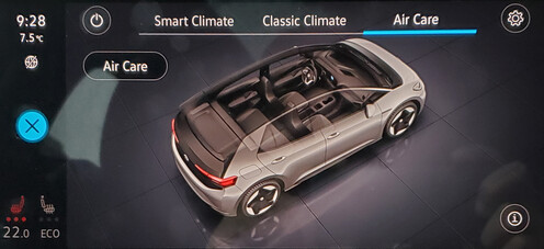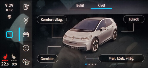 De sajnos az egész rendszer bugos. A fogyasztást áttekintő statisztikában az utolsó töltéstől számolt adat sokszor irreálisan alacsony. A belső világítási fények színét elvileg lehet állítani kézzel, csak hát nem történik semmi. Ugyanitt a fényeffektusok egy vak menüpont, amibe be lehet lépni, csak nincs ott semmi. A rendszer felületei között lehet lapozni kézlegyintéssel — néha. Néha viszont ujjhúzással sem jön össze. A felület bal alsó csücskében mindig látszik, hogy az első két ülés fűtése mennyire aktív, de ha itt bármelyiket megérintjük, akkor nem az van, hogy ezt állítjuk azonnal, hanem átkerülünk a klíma képernyőjére, ahol pixelre ugyanezt a két ikont már meg lehet érinteni és történik is valami. Miért kell ehhez ide belépni, miért nem lehet az alapkijelzőről csinálni mindezt?