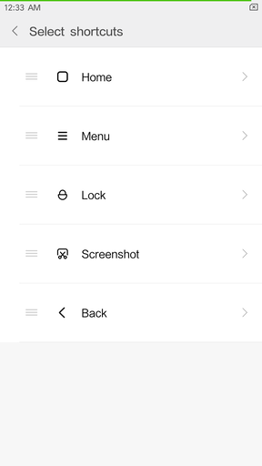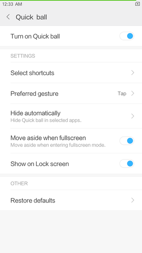 Egyéb preferenciáinkat az Additional Settings menüben tudjuk megadni, ahogy a kisegítő és extra lehetőségek is jobbára ide kerültek. A Quick Ball néhány funkciót tesz könnyen elérhetővé, mint a képernyőkép készítése, illetve a kijelző lezárása, valamint a navigációs gombok jelennek meg tetszőleges elrendezésben. Képernyőfelvételt mellesleg úgy is készíthetünk, hogy három ujjal húzzuk le a kijelzőt, amennyibe ezt a következő menüpontban engedélyezzük.
