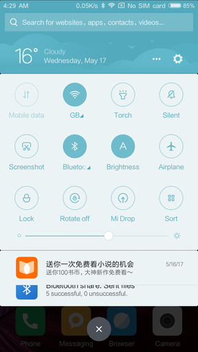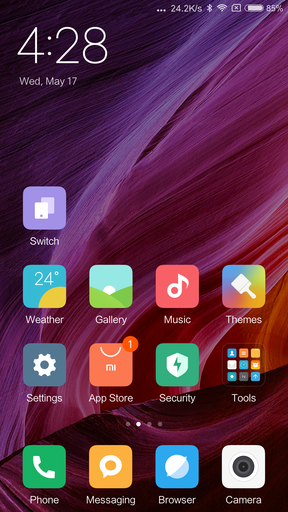 Alkalmazásmenü továbbra sincs, minden ikon és widget a főképernyőkről érhető el, mellesleg a java értelemszerűen mappázva. Az értesítősáv kétfázisú, de klasszikus MIUI felülettel rendelkezik. Az első négy, tetszőlegesen kiválasztott gyorskapcsoló és az értesítések az első fázisban gördülnek elő, míg a többi készség a második fázisban. Kérhetünk egyébként kétoldalas elrendezést, ekkor az értesítések és gyorskapcsolók két külön oldalra kerülnek, ezek között oldalirányú lapozással válthatunk. Az állapotsáv tartalma és a megjelenített információk jellege szintén egyéni elbírálás alá esik.