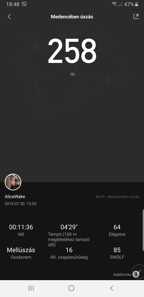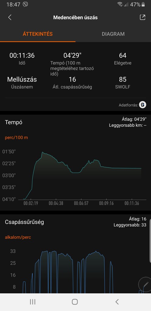 Az edzés végén kapunk időtartamot, tempót (100 méter megtételéhez tartozó idő), az elégetett kalóriák számát, átlagos csapássűrűséget és SWOLF értéket. A pontszámot az egy hossz megtételéhez szükséges idő és a hossz megtételéhez szükséges karcsapások száma adja. Minél kevesebb karcsapással minél rövidebb idő alatt minél nagyobb távolságot teszünk meg, annál jobb. Az érték meg annál, minél kisebb. Az úszás nem a kedvenc sportom, főleg, mert vízben kell csinálni, úgyhogy egy másfél órás aerób és erősítő edzés után ennyi tellett teszt jelleggel.