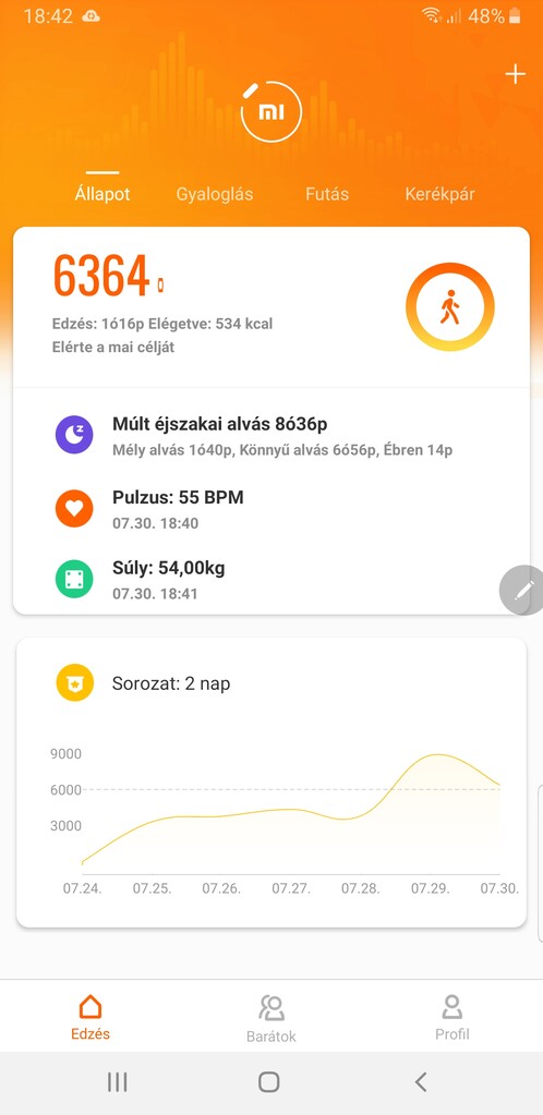 Az óra párosítása nagyon egyszerű, de készüljünk fel rá, hogy az első aktiválást követően jó pár percig frissíteni fog a rendszer. A rendszerkövetelmények és a kompatibilitás sem változott, még mindig minimum 4.4-es Android vagy 9.0-s iOS szükséges az együttműködéshez. Memóriából mindössze 16 MB áll rendelkezésre az eszközben, így maximum pár napi adatot képes tárolni, a zenét a készüléken kell tartanunk, a készüléket pedig magunknál, ha hallgatni is szeretnénk. A rendszermemória ilyen készülékeknél mellékes, de a Mi Band 4-be speciel 512 MB jutott. Az appban, ha nincs okosmérlegünk, önbevallásos alapon kerülnek rögzítésre az alapadatok (nem, kor, testtömeg, magasság), a rendszer pedig ezekkel az értékekkel számol. Például az elégetett kalóriák számát az általa mért pulzus és tevékenységadatokkal kombinálva.
