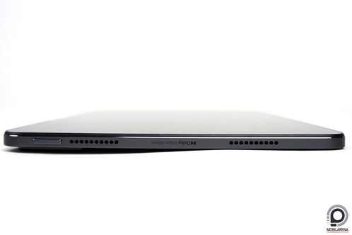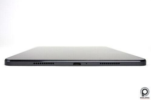 A keret rövidebb oldalába építve négy hangszóró, ezek sztereóban szólnak, remek minőséggel, a jobb rövid oldal közepén pedig egy USB 3.2-es Type-C csatlakozó. Nincs 3,5 mm-es fülhallgató jack, de az USB-C port visz ki hangot is. Az alsó hosszanti oldal üres, a felsőn a hangerőszabályzó gombok és a ceruza mágneses csatlakozója. A ceruzát egyébként tartják olyan erősen a mágnesek, hogy ha megakadna a Pad 6-ot táskába csúsztatva sem feltétlen esne le a Pen. Az elhelyezés iránya azonban nem mindegy, a hegynek a hangerőszabályzó fele kell néznie, csak akkor tölt.
