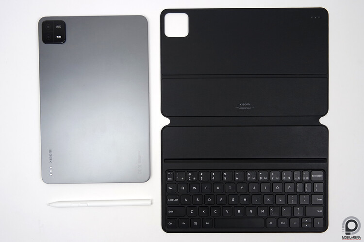 Következő a Xiaomi Pad 6 Keyboard, ez szintén mágnesekkel tapad a táblagépre, de ez a kiegészítő már kihasználja a hátlapon a márkanév melletti három mágneses pogo pines csatlakozót is. Nem kell a billentyűzetet Bluetooth segítségével összekötni a tablettel, elég belerakni a Pad 6-ot és már működik is. A billentyűzetes tok több helyen is kapható itthon 34 és 38 ezer forint közötti árakon, a probléma vele ugyanaz, mint a sima tokkal: nem állítható a táblagép dőlésszöge, a keretet egyáltalán nem védi.