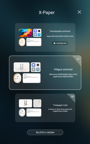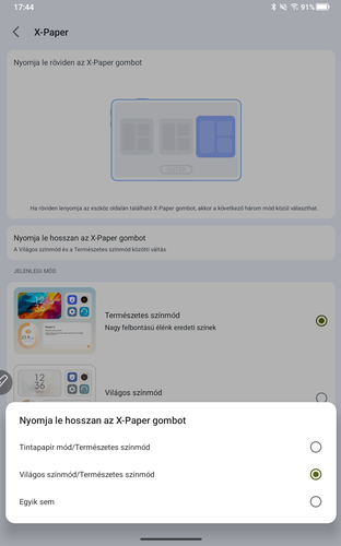 A módváltó gombbal kapcsolható a színes tinta vagy a monokróm tinta mód, előbbi tökéletes képregények olvasásához, utóbbi könyvolvasáshoz. Egy nyomásra a módválasztó ablak ugrik fel, de a beállítások között egyéni igényeink szerint tudjuk a hosszú nyomás funkciót programozni, amivel kihagyható a módválasztó ablak. Előre telepítve csak jegyzetelésre való programot találunk, de a Play Áruházból letölthető például a Kindle app, amin aztán simán és kényelmesen olvashatunk. Sajnos a módváltó gomb melletti bekapcsoló gombból kimaradt az ujjlenyomat-leolvasó, így csak a 2D-s arcfelismerés elérhető biometrikus azonosítási módszerként. Ez elfogadható pontossággal működik, a 13 megapixeles előlapi kamera a rövid oldal közepén jellemzően gyenge fények mellett nem ismer fel elsőre. A kamera mellett környezeti fényérzékelő és közelségérzékelő található.