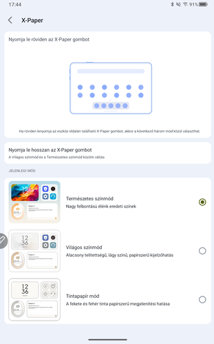 Térjünk vissza a panelre. IPS LCD-ről van szó 10,95”-es a kijelzőméret, 1200 x 1920 pixeles a felbontás (207 ppi a képpontsűrűség). A panel az sRGB skála 95%-át képes lefedni, frissíteni 60 és 90 Hz-es értékeken tud, adaptív módban a két érték között változtat az Android. A tipikus fénysűrűség a gyártó szerint 400 nit, mérőműszerünk alatt a panelen kézi és automata módban is 392 nitet mértünk, a háttérvilágítás egységes. A minimális fényerő meglepően magas, viszont a panel színhelyes, de van kézi beállítási lehetőség a színhőmérsékletre vonatkozóan. A TCL NXTVision technolgóiája is adott a képjavításhoz, emellett ugye megvan az X-Paper mód (alias NXTPaper), amivel lehet váltani a színes és monokróm tintapapírt szimuláló módok között. A panel, így a Magic Note Pad megkapta a TÜV Rheinland szemkímélő minősítését alacsony kékfény-kibocsátása miatt.